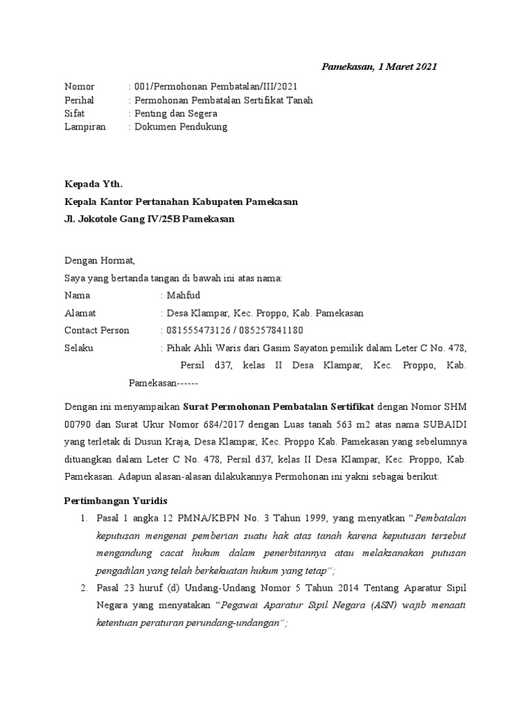 Permohonan Pembatalan Sertifikat Tanah Pdf